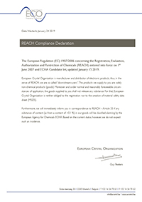 European Crystal Organization is manufacturer and distributor of electronic products, thus, in the sense of REACH, we are so called “downstream-users”. The products we supply to you are solely non-chemical products (goods). Moreover and under normal and reasonably foreseeable circumstances of application, the goods supplied to you shall not release any substance. For that, European Crystal Organizationl is neither obliged to the registration nor to the creation of material safety data sheet (MSDS).